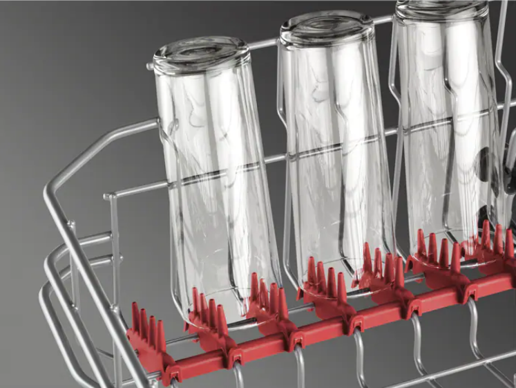 Górny kosz: 2 składane półki, 2 składane wsporniki do szklanek, 2 x stabilizatory SoftSpikes, 6 uchwytów na kieliszki SoftGrips, składane uchwyty na filiżanki, plastikowy uchwyt, boczne uchwyty kosza