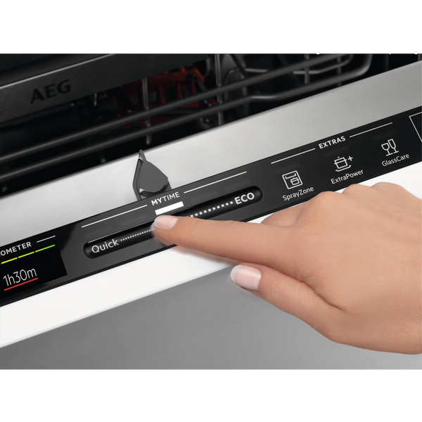 System QuickSelect zapewnia optymalną kontrolę nad zmywarką. Wybierz za pomocą suwaka czas trwania programu, a następnie – za dotknięciem – dotykowe opcje. Całą resztą zajmie się zmywarka. Uzyskaj pożądany efekt zmywania w dogodnym dla siebie czasie. I oczywiście idealnie czyste naczynia.