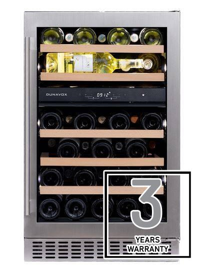 Dwustrefowy, zintegrowany model mogący pomieścić 38 butelek wina. Elegancki wygląd zewnętrzny i uchwyt ze stali nierdzewnej sprawiają, że DUNAVOX Flow-38 idealnie pasuje do nowoczesnej kuchni. Butelki są eksponowane na półkach z litego drewna bukowego i otoczone białym, bursztynowym i niebieskim oświetleniem wewnętrznym LED Temperatura w górnej strefie musi być niższa niż w dolnej, zalecana różnica temperatur wynosi 4°C. Należy pamiętać, że ten model nadaje się do użytku wolnostojącego lub do zabudowy.
