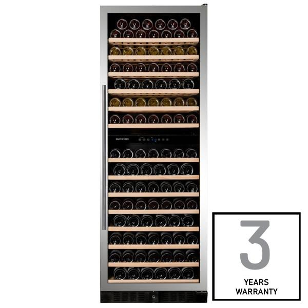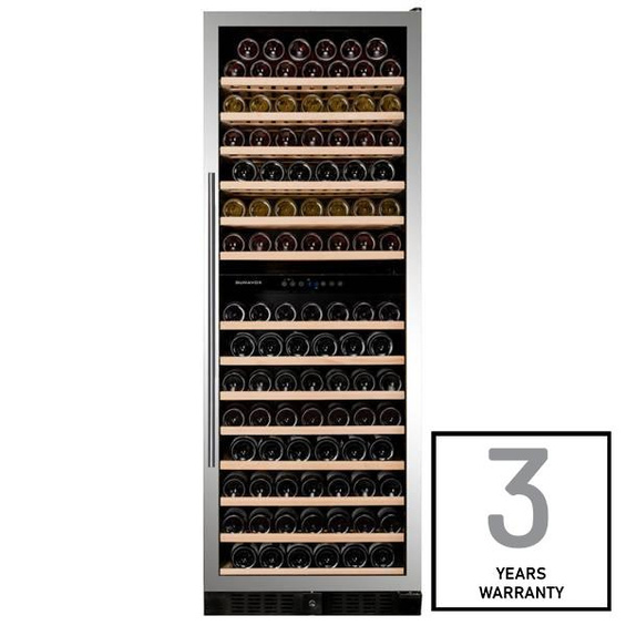 Dwustrefowy, wolnostojący model do przechowywania 181 butelek z serii Grande firmy Dunavox. Elegancki wygląd zewnętrzny - Wersja Inox posiada uchwyt ze stali nierdzewnej, a wersja czarna posiada uchwyt również w kolorze czarnym. DUNAVOX Grande-181 pasuje idealnie do nowoczesnych kuchni, hoteli i restauracji. Butelki są umieszczone na drewnianych półkach w oszałamiającym jasnoniebieskim wnętrzu. Temperatura w górnej strefie musi być niższa niż w dolnej. Należy pamiętać, że ten model nadaje się do użytku wolnostojącego lub do zabudowy.