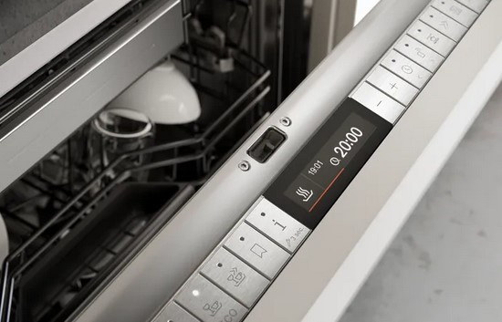 - Wyświetlacz ze wskaźnikiem czasu, elektroniczny wskaźnik braku soli i nabłyszczacza, wskaźnik dopływu