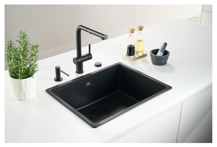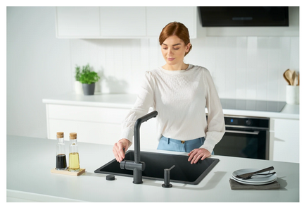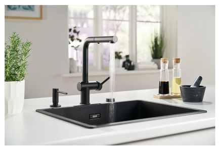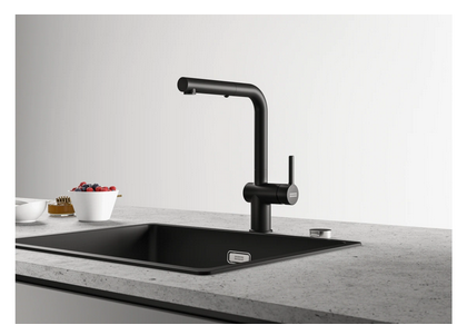 Minimalistyczna bateria kuchenna z wyciąganą wylewką z funkcją prysznica w kolorze czarny mat. Baterie z linii Active posiadają ceramiczną głowicę i laminarny strumień, który eliminuje większość rozprysków i ułatwia codzienne mycie i zmywanie. Co więcej posiadają technologię Eco, która pozwala oszczędzać wodę i energię.