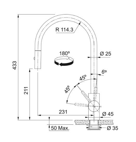 • Zakres obrotu wylewki 180°