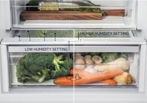 Ciesz się pysznymi, świeżymi warzywami, dzięki szufladzie z funkcją kontroli wilgotności. Zamknięty obieg powietrza tworzy idealną przestrzeń dla ziół i warzyw liściastych, a otwarty zapewnia optymalne warunki przechowywania.