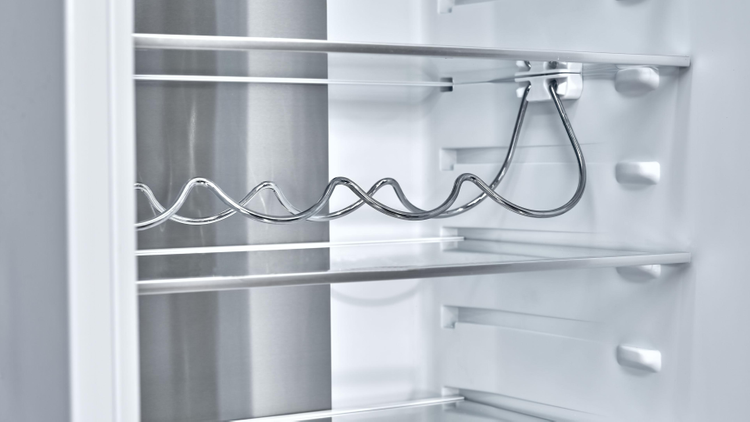 Elegancki, metalowy panel tylny w komorze chłodziarki.