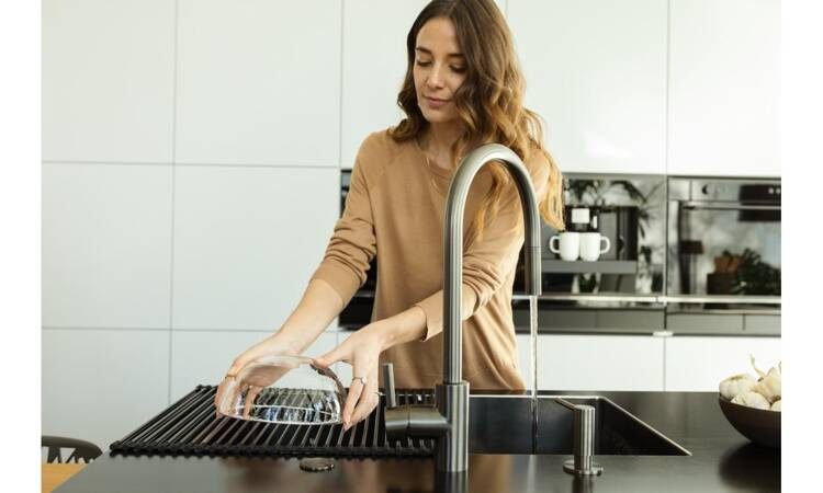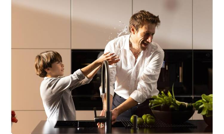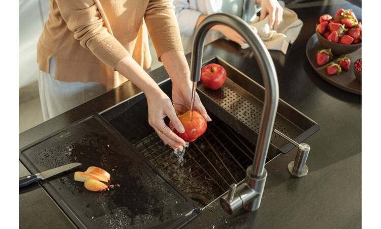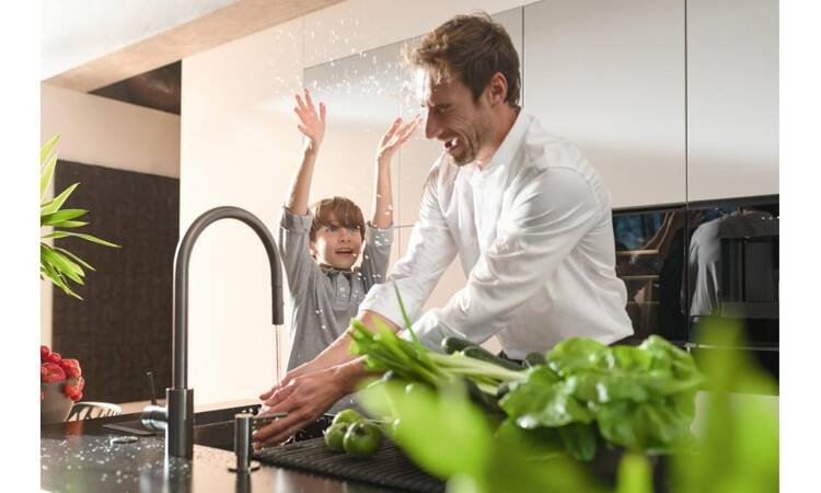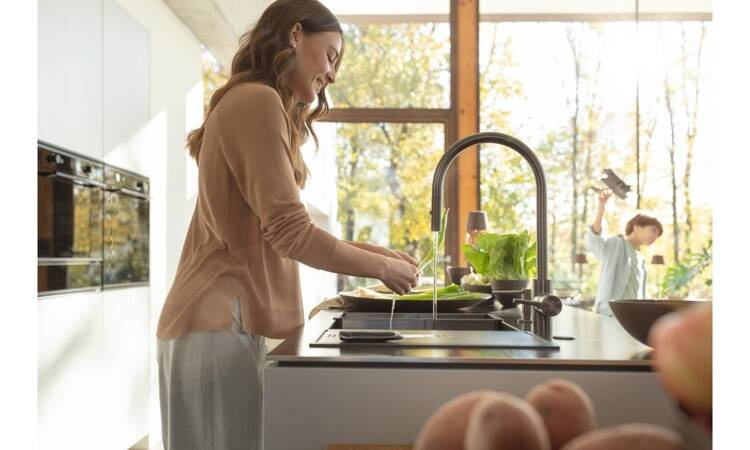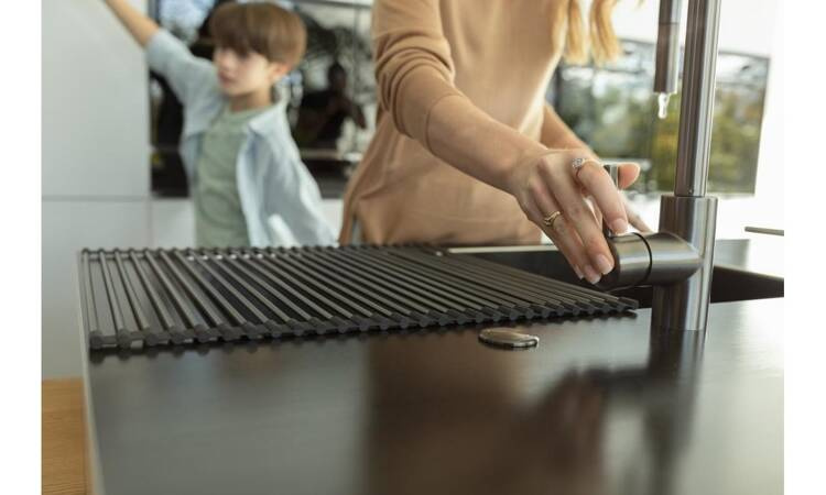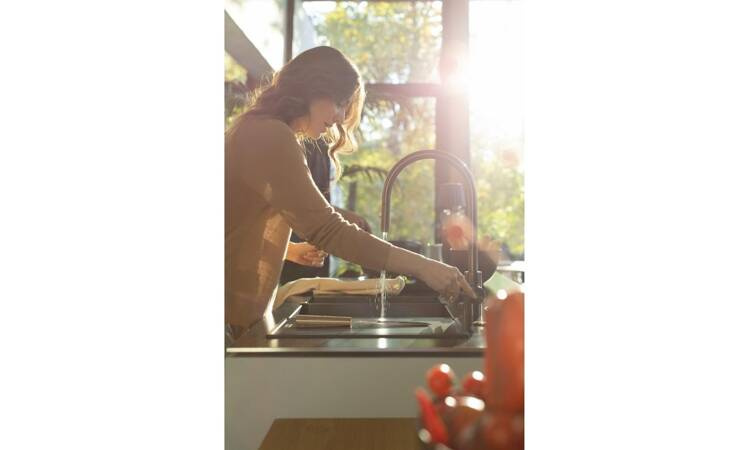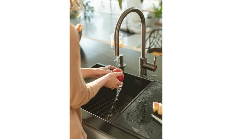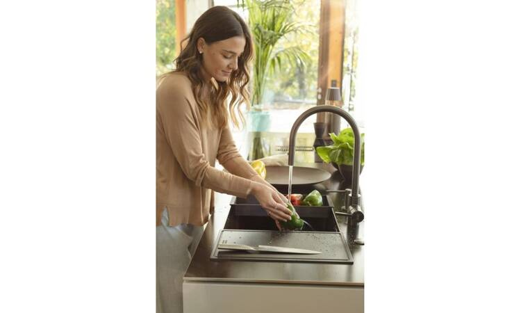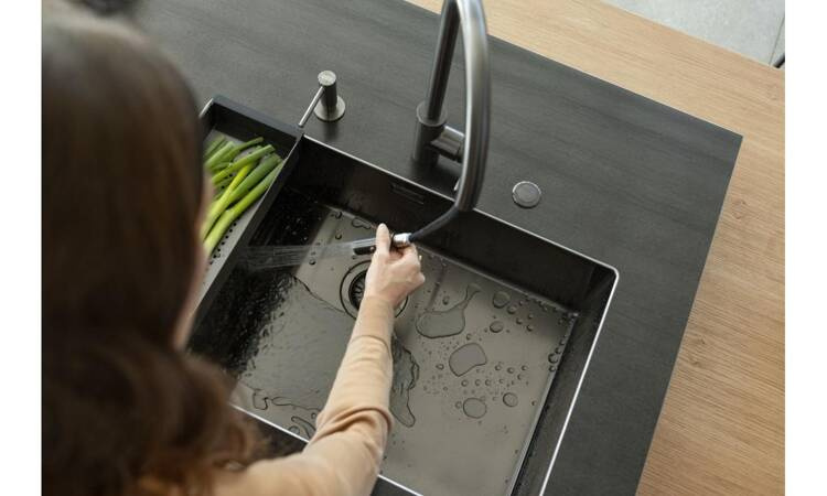 - Bateria kuchenna z wyciąganą wylewką z funkcją prysznica Eos Neo pull-out spray w kolorze antracyt. Innowacyjny, ruchomy przegubwyciąganej wylewki – zwiększa zakres ruchu i komfort pracy. Zakres ruchu dźwigni mieszacza 0°-90° ułatwia sterowanie strumienie