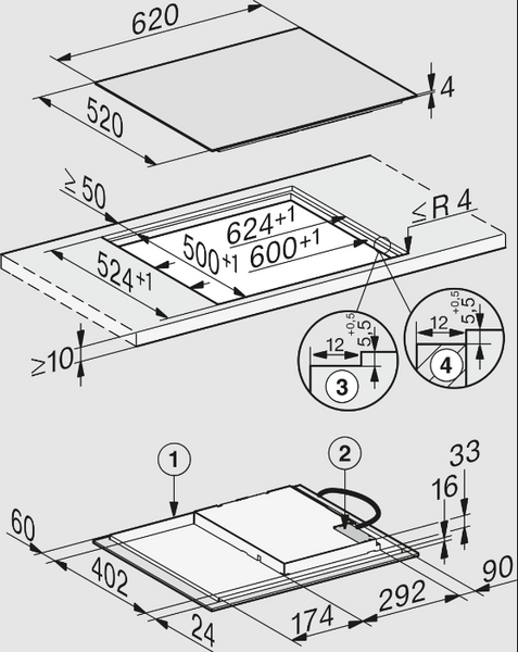 | Zewnętrzne wymiary wycięcia w mm (głębokość) przy wpasowaniu w blat | 524 |