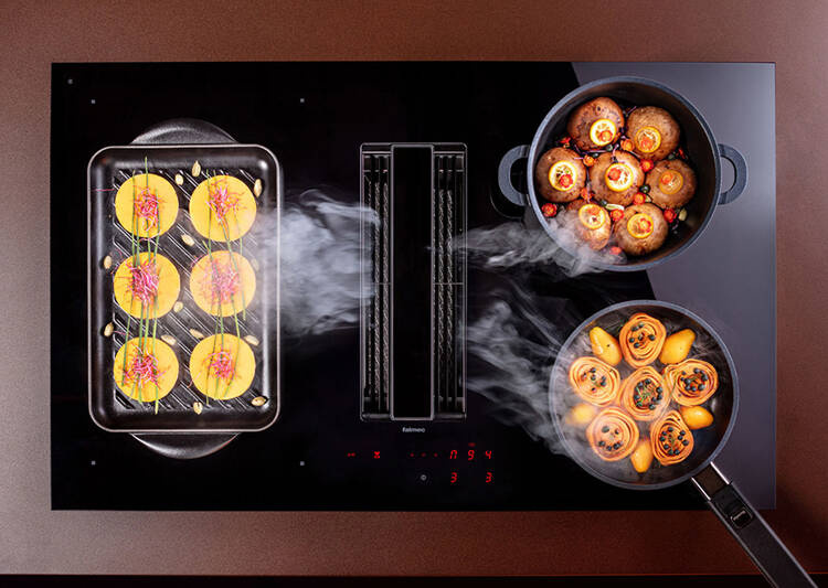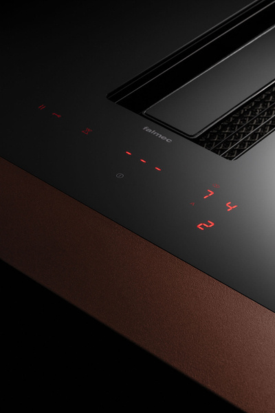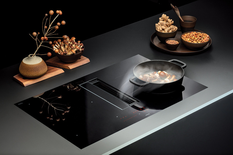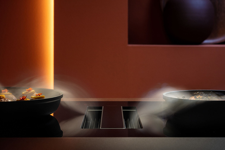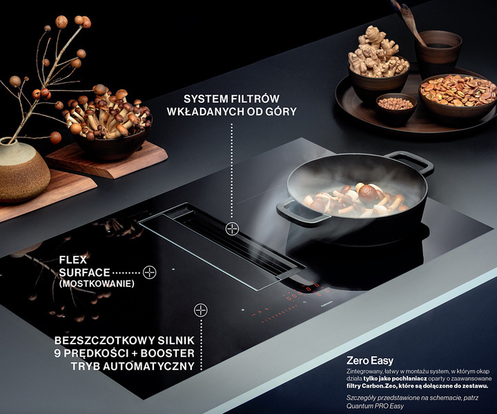 - Zero charakteryzuje się czystym, subtelnym designem, który pozwala na idealną integrację z blatem kuchennym. Centralna część zasysająca ma szklany panel, który można przesuwać, aby skupić przepływ powietrza tam, gdzie jest to potrzebne.