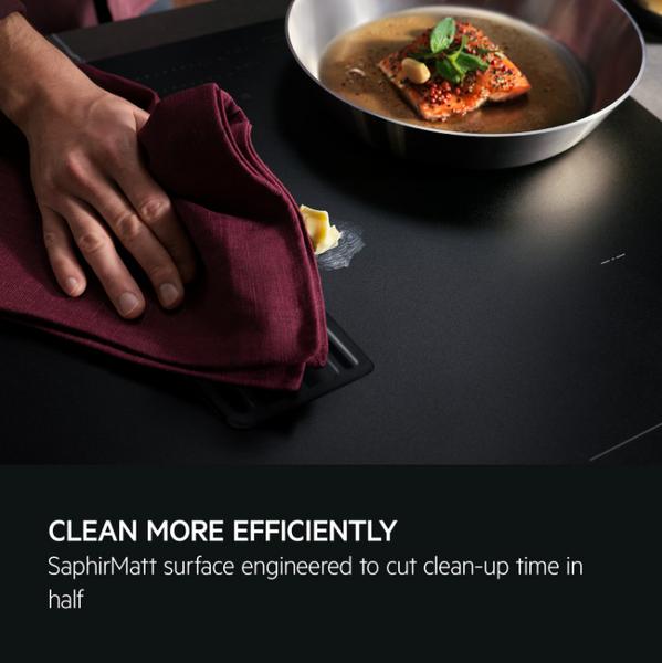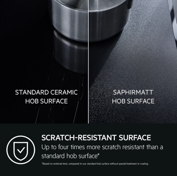 Szkło SaphirMatt zapewnia idealną ochronę przed zarysowaniami w porównaniu ze standardowymi powierzchniami grzewczych płyt ceramicznych. Eleganckie, czarne, matowe wykończenie jest odporne na odciski palców i plamy, dzięki czemu płyta grzewcza dłużej wygląda jak nowa.