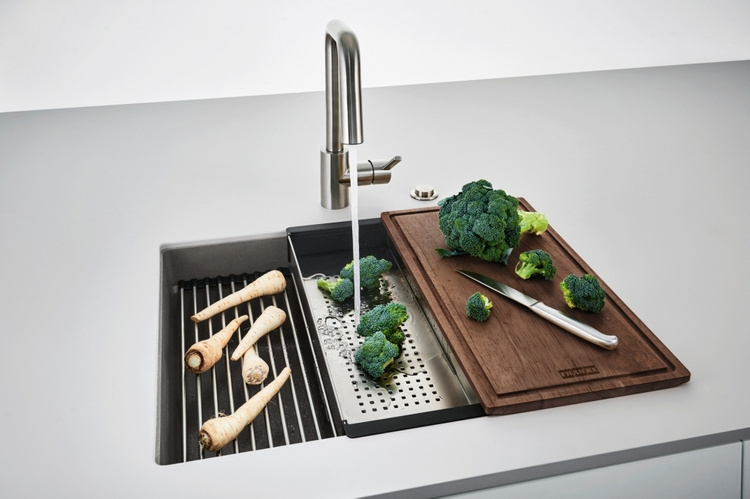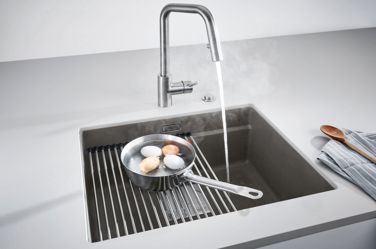 Zlewozmywak do podbudowy Kanon KNG 110-52 o dużej komorze, która pomieści naczynia i garnki o większych wymiarach posiada półkę, która ułatwia montaż baterii oraz przycisku do korka automatycznego, dzięki swoim podfrezowanym otworom, estetyczny ukryty przelew oraz osłonę odpływu, która nie ogranicza przepływu wody, a jednocześnie sprawia, że staje się on niewidoczny, nadając całości nowoczesny wygląd. Dzięki delikatnemu wgłębieniu wewnątrz komory możesz stosować akcesoria na dwóch poziomach. Linia Kanon to elegancja i prostota. Jej design skupia się na minimalizmie, prezentując proste linie i geometryczne kształty. Zlewozmywak został wyprodukowany z materiału Fragranite, który składa się w 80% z naturalnego granitu i został zabezpieczony technologią Sanitized®, która ogranicza rozwój bakterii do 99%. Co więcej, jest on odporny na zarysowania, uderzenia i zaplamienia oraz krótkotrwałe działanie wysokiej temperatury. Zlewozmywak zawiera w zestawie korek automatyczny Flow Pro sterowany przyciskiem Easy Click w wykończeniu ze stali szlachetnej, 3 1/2".