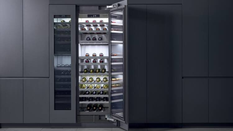This Signature Kitchen Suite Wine Cellar, integrated or panel ready, can hold 113 bottles. It guarantees the perfect preservation of various wines, thanks to separately adjustable temperature and humidity zones.