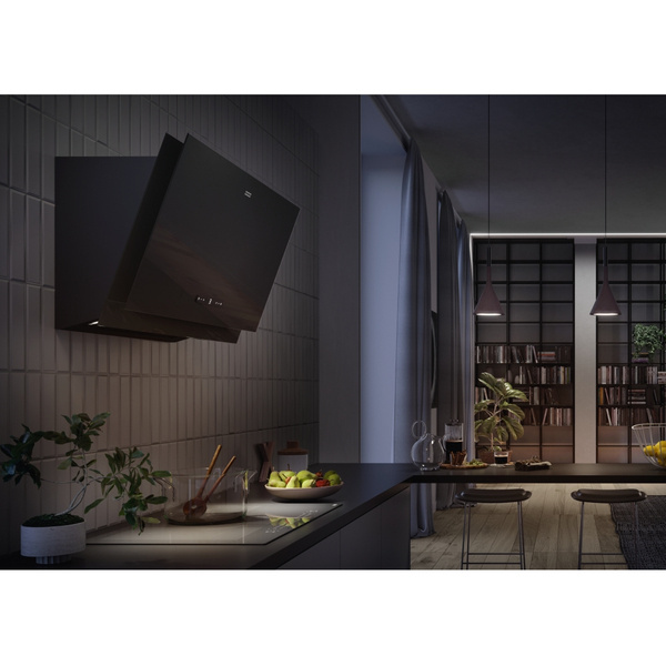 Okap ścienny Maris 2.0 FMA 2.0 907 BK KL w wykończeniu z czarnego szkła. Nowoczesny wygląd okapu podkreślany jest innowacyjnym interfejsem użytkownika, bazującym na cyfrowym wyświetlaczu dot matrix z animacją. Okap przyjemnie zaskoczy niewielkim hałasem, jaki generuje w stosunku do jego wydajności, dzięki technologii Sound Pro. W trybie intensywnym zapewnia wydajność aż 730 m3/h, co gwarantuje szybkie pozbycie się zapachów znad płyty. Skuteczność pochłaniania jest dodatkowo zwiększona dzięki dwóm powierzchniom wlotu powietrza (od dołu i przodu). Klasa energetyczna okapu to A+.