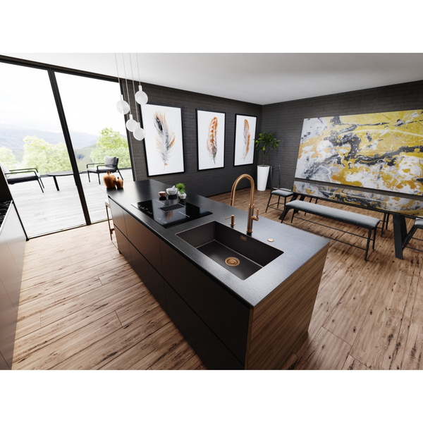 Bateria kuchenna z wyciąganą wylewką z funkcją prysznica Mythos Masterpiece pull-out spray. Model stworzony, aby być atrakcją w Twojej kuchni, wyróżnia się on wysokim i smukłym wzorzystym korpusem oraz wyrafinowanym mieszaczem. Jego wysoka wylewka sprawia, że z łatwością napełnisz duże garnki czy wazony. Innowacyjny, ruchomy przegub wyciąganej wylewki zwiększa zakres ruchu i komfort pracy. Zakres ruchu dźwigni mieszacza 0°-100° ułatwia sterowanie strumieniem wody, również wtedy, kiedy bateria znajduje się blisko ściany. Model posiada strumień laminarny - specjalna konstrukcja aeratora zapewnia zwarty i krystaliczny strumień wody eliminujący rozpryski oraz ceramiczną głowicę, która jest niezawodna w kontakcie z wodą.