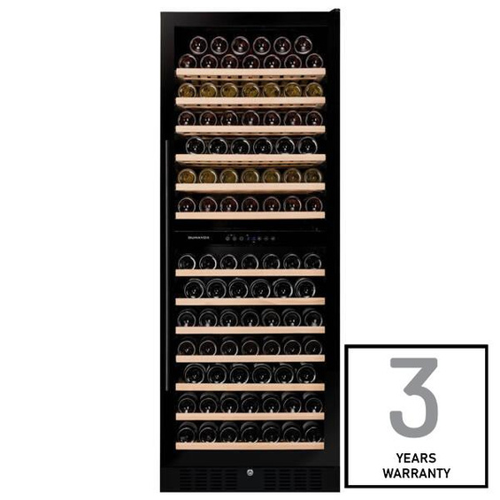 Dwustrefowy, wolnostojący model na 108 butelek z ekskluzywnej linii. Elegancki wygląd zewnętrzny - DUNAVOX Grande-108 idealnie nadaje się do nowoczesnych kuchni, barów i hoteli. Butelki są eksponowane na półkach z litego drewna bukowego i otoczone białym, bursztynowym i niebieskim oświetleniem LED wewnątrz. Górna strefa musi być zimniejsza niż dolna, zalecana różnica temperatur wynosi 8°C. Należy pamiętać, że ten model nadaje się do użytku wolnostojącego lub do zabudowy.
