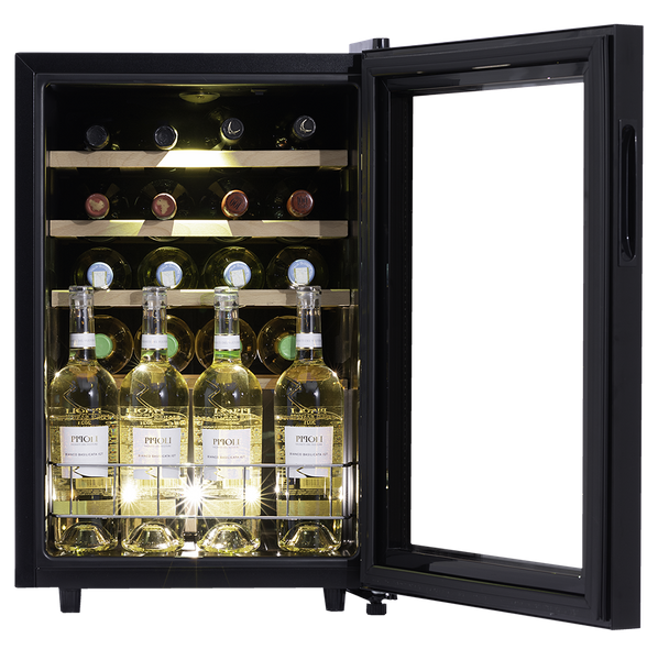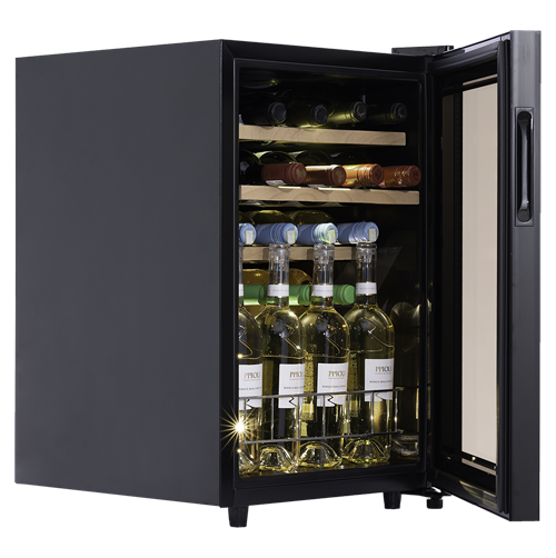 Model jednostrefowy, mieszczący 20 butelek. Chłodziarka ma wpuszczany uchwyt, a butelki spoczywają na solidnych drewnianych półkach. Chłodziarka umożliwia przechowywanie otwartych butelek. To urządzenie nie nadaje się do zabudowy lub instalacji pod blatem.