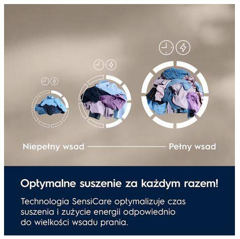 SensiCare mierzy temperaturę i poziom wilgotności każdego załadunku oraz odpowiednio dostosowuje czas suszenia i zużycie energii, aby chronić ubrania przed zbyt wysoką temperaturą i przesuszeniem. Ubrania dłużej będą wyglądały na nowe bez marnowania energii.