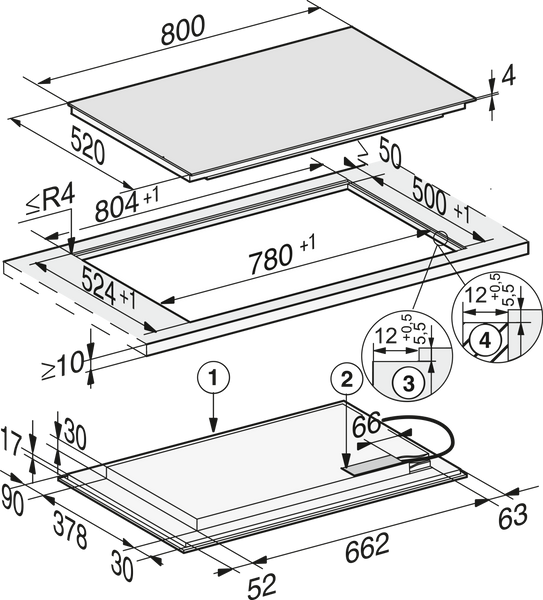 - Wewnętrzne wymiary wycięcia w mm (szerokość) przy wpasowaniu w blat 780