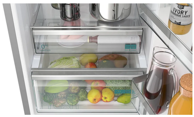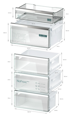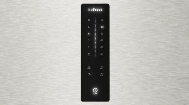- Elementy obsługi: Tryb oszczędny / urlopowy, Wyłącznik supermrożenia, Wyłącznik superchłodzenia, Wskaźnik temperatury zamrażania, Wskaźnik temperatury chłodzenia, Alarm otwartych drzwi zamrażarki, Alarm awarii zamrażalnika, Alarm otwartych drzwi chłodziarki