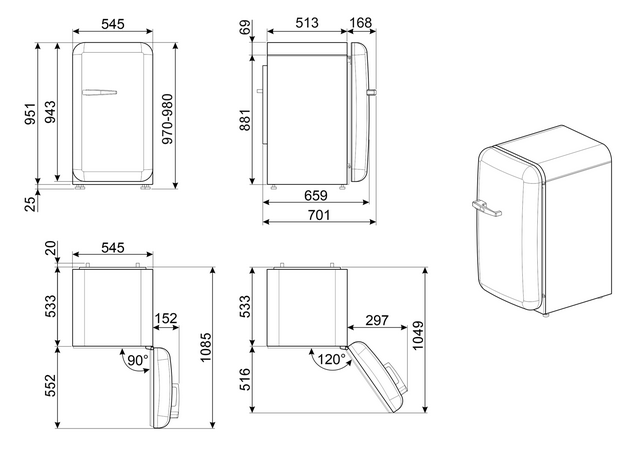 - Głębokość przy otwartych drzwiach pod kątem 90°: 1085 mm