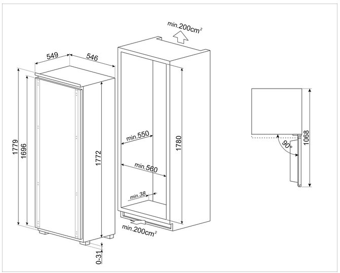 • Szerokość produktu z maksymalnie otwartymi drzwiami: 548 mm