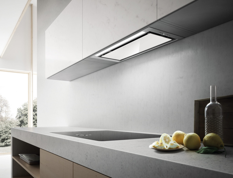 Dyskretny okap podszafkowy, dostępny w wykończeniach ze stali nierdzewnej, czarnego matu i stali nierdzewnej/białego szkła, z rozproszonym oświetleniem LED i sterowaniem dotykowym.