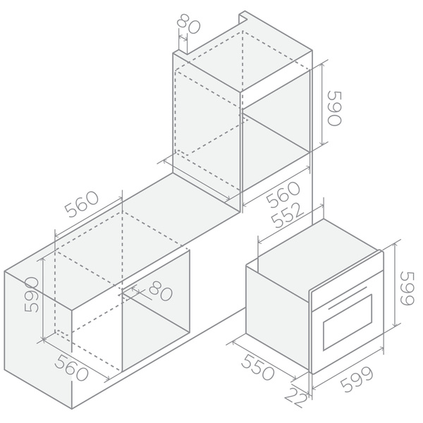 - Wymiary wnęki do instalacji piekarnika: 56x59x56 cm