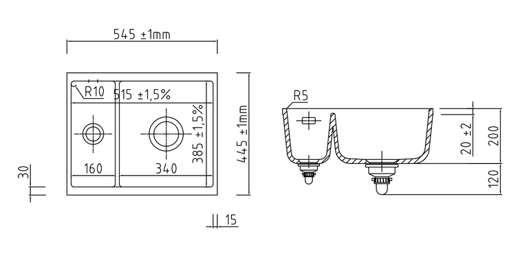 • UWAGA: Zalecamy, ze względu na tolerancję wymiarów (+/- 1,5%), wycinanie otworu w blacie przy użyciu dostarczonej sztuki zlewozmywaka. Zlewozmywak można podwiesić za pomocą zaczepów do blatów o grubości min. 30 mm. Jeśli zlewozmywak będzie przyklejony, mogą być użyte cieńsze blaty.