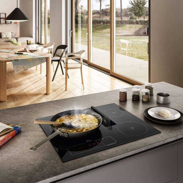 Niebywały komfort gotowania. Wreszcie można zacząć gotować, nawet w największych naczyniach, Trójstrefowa płyta z wyciągiem została zaprojektowana z myślą o elastyczności podczas gotowania, by naczynia o dużej średnicy mogły także zostać wykorzystane. System wyciągu jest niewidoczny i pracuje cicho, także w trybie automatycznym. Przy wyłączonym wyciągu powierzchnia płyty odznacza się całkowicie gładką powierzchnią, wyjątkową pod względem estetycznym. Czarne szkło i wyrafinowany sitodruk tworzą minimalistyczny design płyty, która doskonale wpisuje się w stylistykę każdej kuchni. Płytę aktywuje się jednym dotknięciem, a dzięki sterowaniu suwakami, wszystkie funkcje płyty kuchennej obsługujesz intuicyjnie. Zapachy i opary są wychwytywane przez bardzo efektywny system wyciągu. Filtry usuwające nieprzyjemne zapachy można łatwo wyjmować i czyścić, a specjalny zawór umożliwia odprowadzanie rozlanych płynów w celu zapewnienia pełnej higieny.