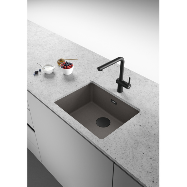 Zlewozmywak do podbudowy Maris MRG 110-52 został wyposażony w czarny, matowy odpływ, co nada Twojej kuchni głębi i elegancji, podkreślając jej wyjątkowy charakter. Ten model o dużej komorze, która pomieści naczynia i garnki o niestandardowych wymiarach posiada funkcjonalny i estetyczny ukryty przelew oraz osłonę odpływu, która nie ogranicza przepływu wody, a jednocześnie sprawia, że staje się on niewidoczny. Osłona odpływu dopełnia komorę, nadając całości nowoczesny wygląd. Linia Maris wyróżnia się minimalistycznym wzornictwem, charakteryzującym się klarownymi i prostymi konturami. Zlewozmywak został wyprodukowany z materiału Fragranite, który składa się w 80% z naturalnego granitu, a jego wyjątkowo gładka powierzchnia skutecznie utrudnia osadzanie i rozwój bakterii. Co więcej, jest on odporny na zarysowania, uderzenia i zaplamienia oraz krótkotrwałe działanie wysokiej temperatury. Zlewozmywak zawiera w zestawie korek zatyczkowy Color Line 3 1/2".