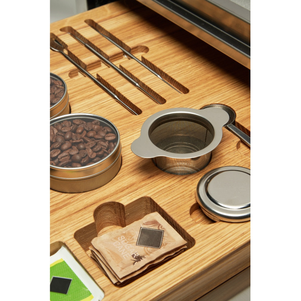 Szuflada z akcesoriami pod ekspres do kawy Mythos FMY 14 CMD XS w wykończeniu z czarnego szkła i stali szlachetnej. Na wyposażeniu znajduje się: pojemniki na kawę i herbatę, zestaw do Latte Art, zaparzacz, łyżeczka oraz przestrzeń do przechowywania herbaty i cukru.
