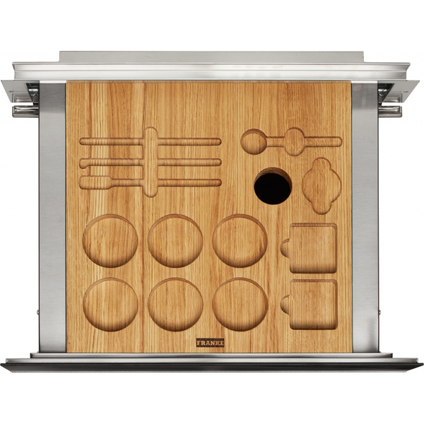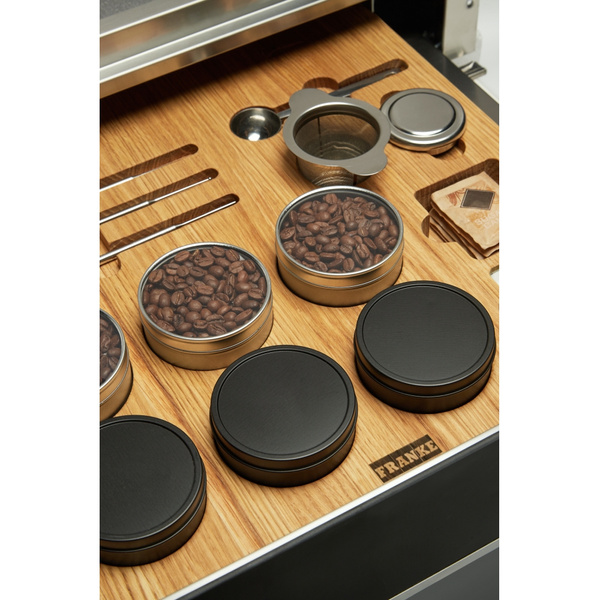 • Szuflada z akcesoriami pod ekspres do kawy Mythos FMY 14 CMD XS w wykończeniu z czarnego szkła i stali szlachetnej.