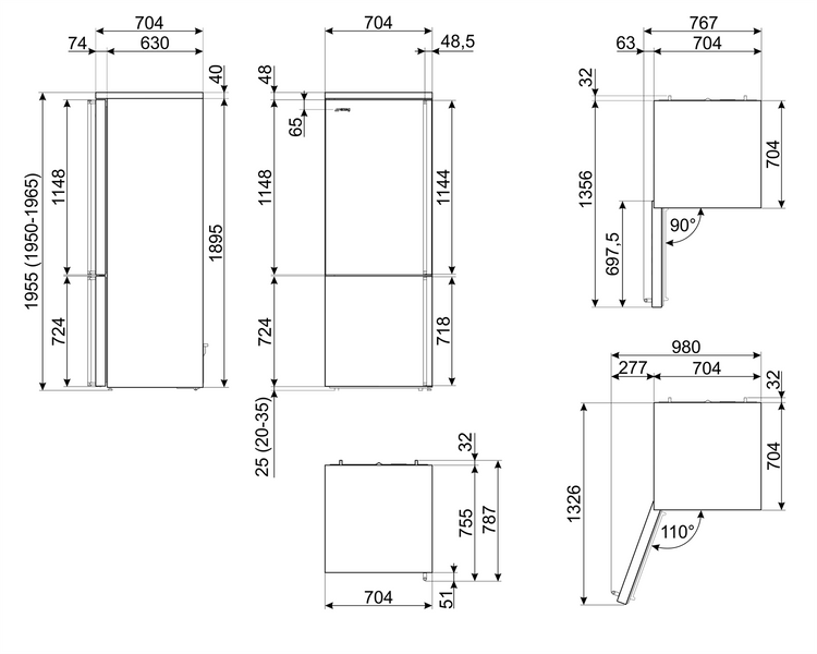 • Głębokość przy otwartych drzwiach pod kątem 90°: 1356 mm