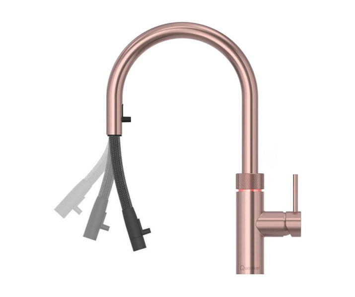 Kran Quooker Flex Round Różowa Miedź to uniwersalny kran kuchenny Quooker z wygodnym, elastycznym i wyciąganym wężem. Idealnie nadaje się do większych i podwójnych zlewów.