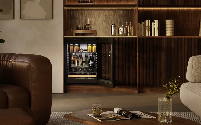 Połączenie eleganckiego wyglądu i praktyczności z myślą o wszystkich napojach: przezroczyste półki szklane ułatwiają przechowywanie różnego rodzaju butelek — wysokość półek można łatwo regulować za pomocą jednego ruchu. Ozdobne wykończenie w kolorze BlackSteel nadaje wnętrzu nowoczesny i stylowy wygląd.