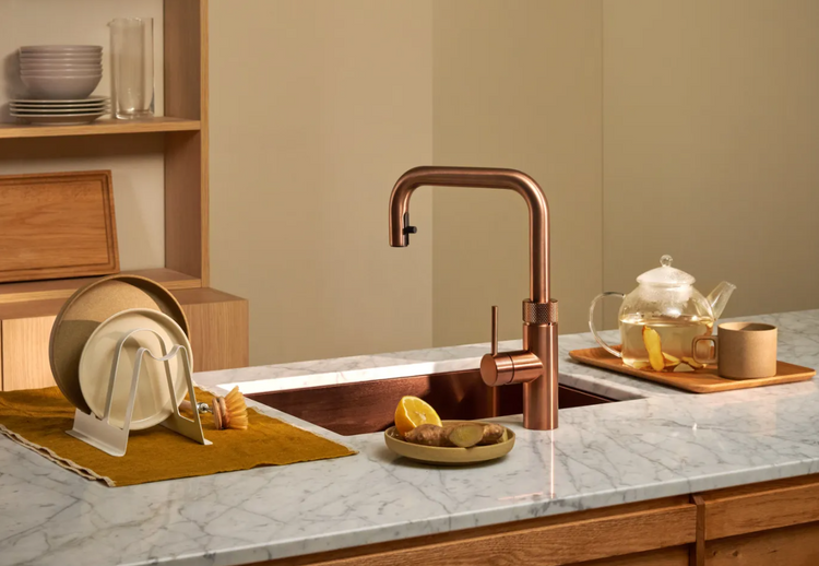 Kran Quooker Flex Square Różowa miedź to uniwersalny kran kuchenny Quooker z wygodnym, elastycznym i wyciąganym wężem. Idealnie nadaje się do większych i podwójnych zlewów.